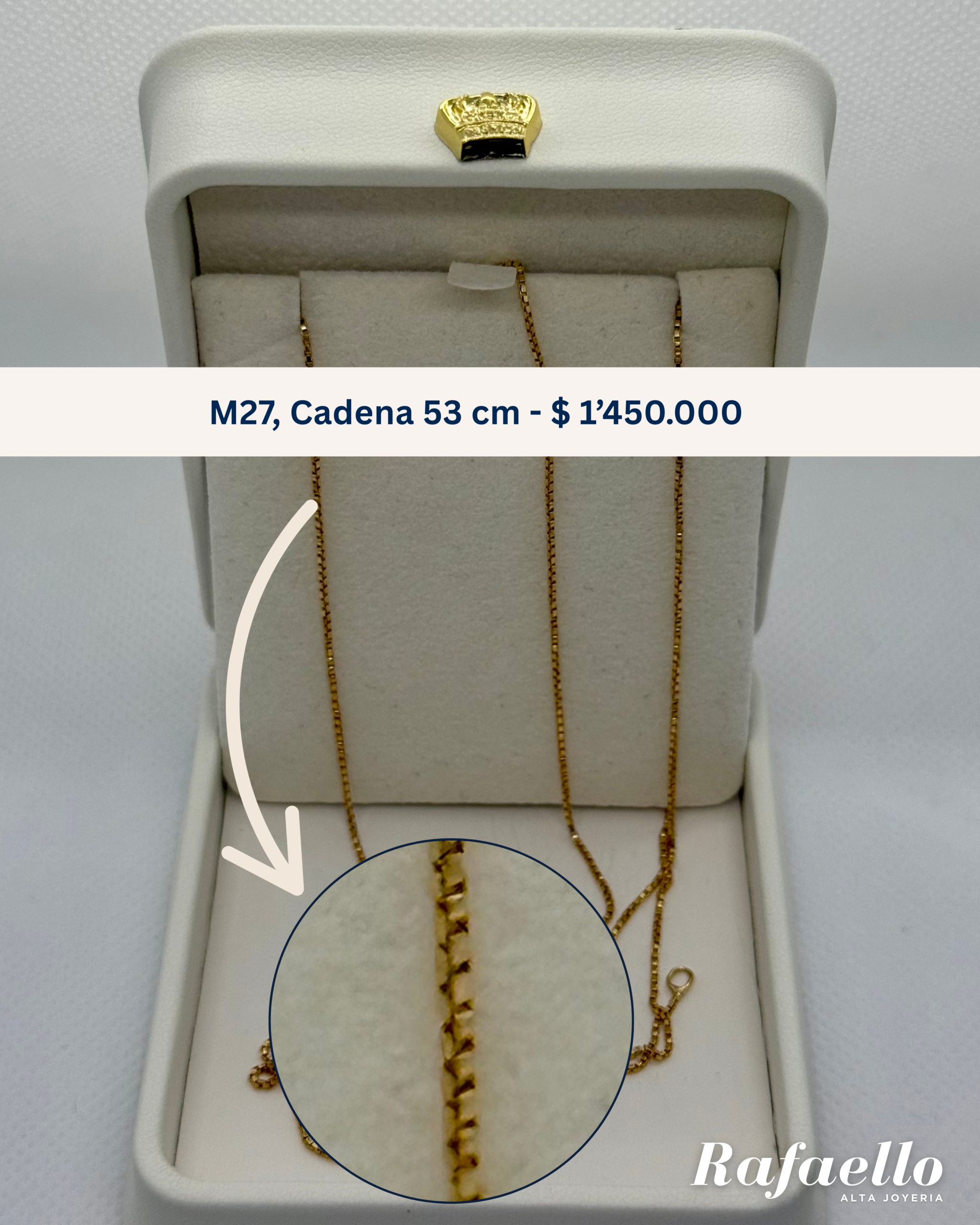 M-27 | Cadena tejido rectángulos en oro italiano de 18 kilates de 53 cm, peso aproximado 2,5 g, sin gemas.
